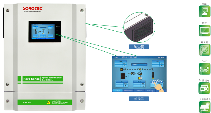 1、触摸显示屏2、PV和市电能同时带载3、输出功率因数 PF=1.04、离并网带储存5、发电量、负载历史信息和故障信息记录6、交流输出和充电时间设置7、充电电压和充电电流定时8、外部wi-fi设备可选9、3-5kw可实现最大6台并机10、电池连接可选12、宽pv输入范围120-450vdc13、独立cpu14、最大pv阵列功率4500 w15、太阳能和电力供应负荷,当太阳能发电不能保证负荷