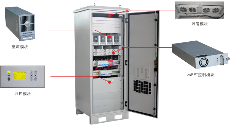 1、可根据站点环境,接入太阳能,市电,油机组成不同形式的互补供电结构;