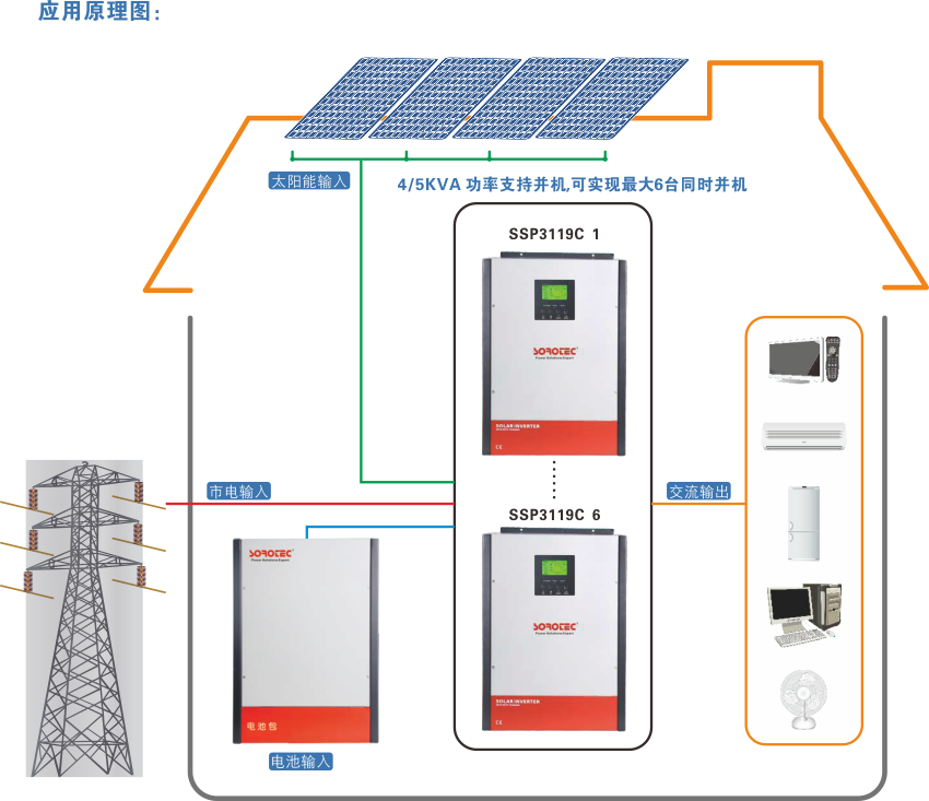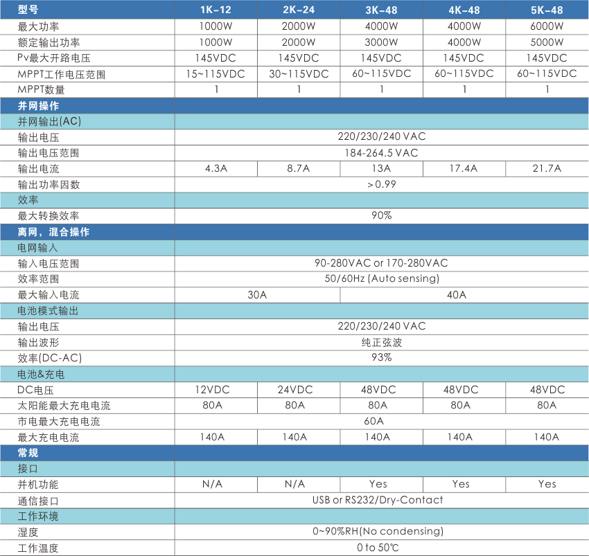 1、纯正弦波2、离并网一体操作3、程序提供PV,电池及市电优先设置4、用户可以调整充电电压和电流5、通过监控软件可实时监控运行状态和控制操作6、3KVA/4KVA/5KVA机型支持并机,可实现最大6台同时并机7、操作模式:并网、后备离并网