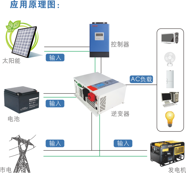 主要应用于家庭太阳能发电,用于带动家用小功率负载的电器。