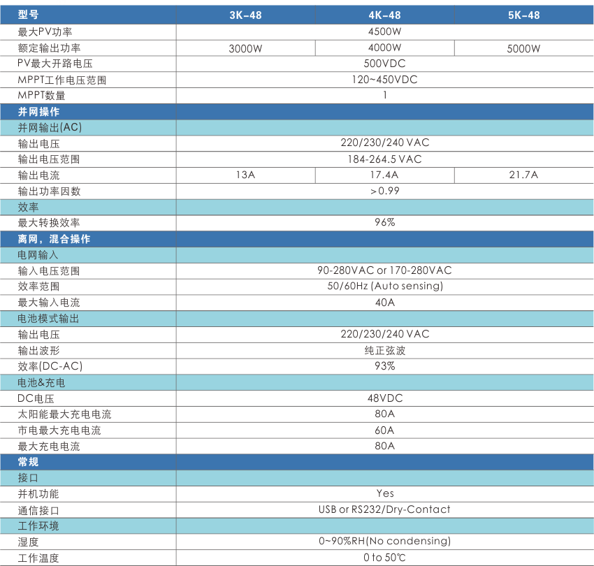 1、触摸显示屏2、PV和市电能同时带载3、输出功率因数 PF=1.04、离并网带储存5、发电量、负载历史信息和故障信息记录6、交流输出和充电时间设置7、充电电压和充电电流定时8、外部wi-fi设备可选9、3-5kw可实现最大6台并机10、电池连接可选12、宽pv输入范围120-450vdc13、独立cpu14、最大pv阵列功率4500 w15、太阳能和电力供应负荷,当太阳能发电不能保证负荷