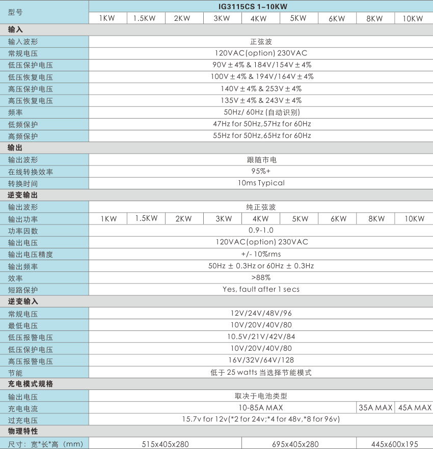 索瑞德IG3115CS逆变器系列采用的工频纯正弦波设计,内置工频隔离变压器,还可以选择旁路稳压功能。三段式智能充电控制,还兼容发电机输入,使产品使用更加广泛。产品被广泛应用于光伏发电系统,家庭后备电源等。